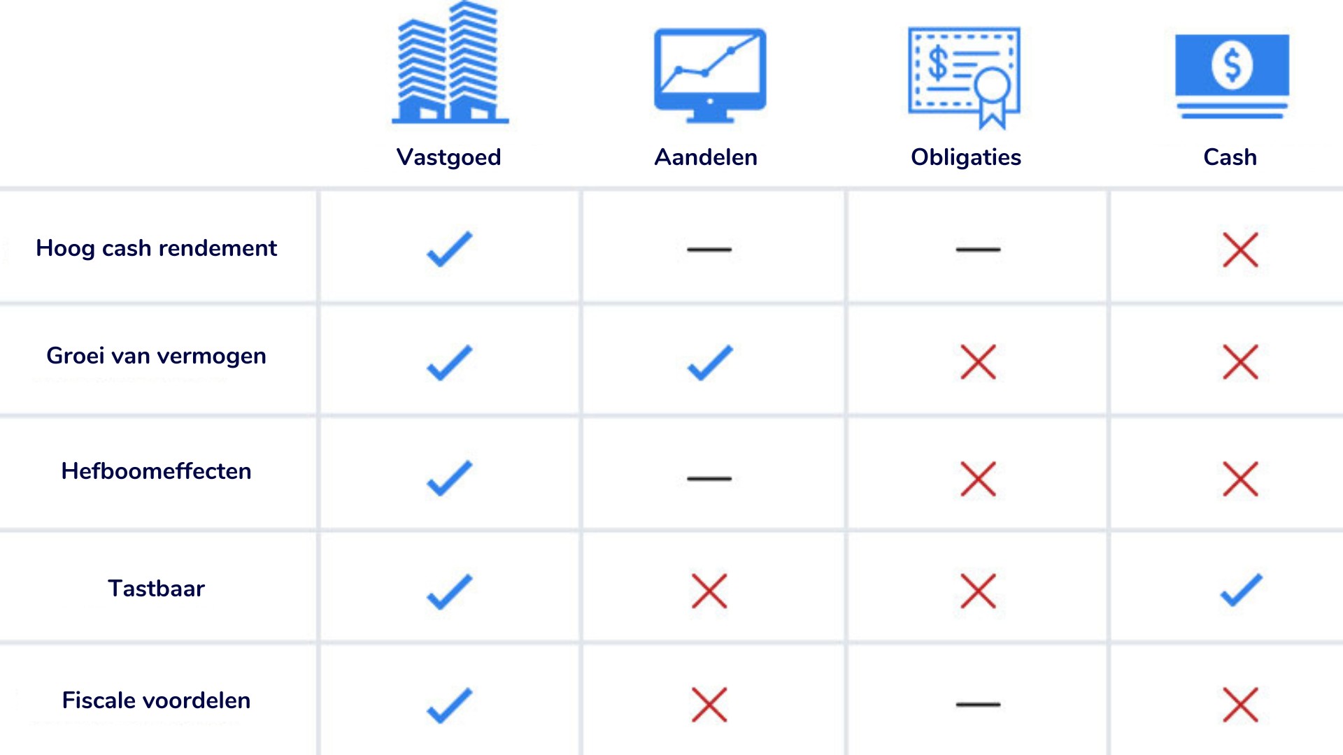 Een gezond vermogen is een gespreid vermogen. Zo heb je best wat aandelen, obligaties en cash in jouw portefeuille. Vastgoed is hier ook een belangrijk onderdeel van. Het is een stabiele en veilige investering met op lange termijn mooie meerwaardes. Dankzij de maandelijkse huuropbrengsten kan je bovendien rekenen op een hoog cash rendement. Een must have in elk vermogen.